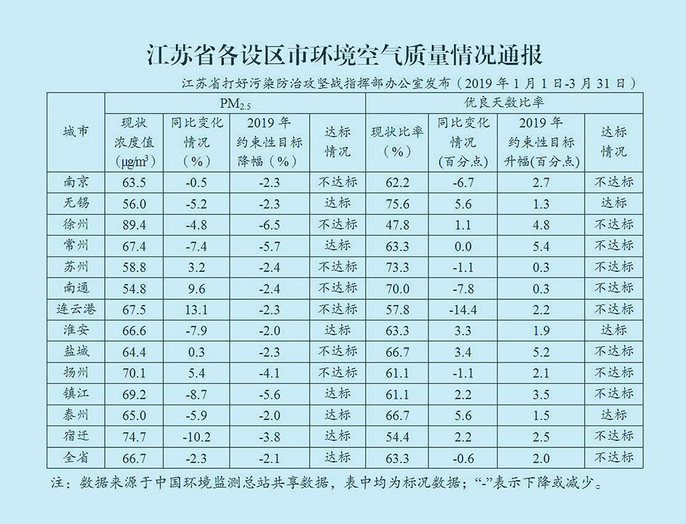 通報顯示,2019年1月1日至3月31日,對照2019年各設(shè)區(qū)市環(huán)境空氣質(zhì)量改善約束性目標(biāo),13個設(shè)區(qū)市中,無錫、常州、淮安、鎮(zhèn)江、泰州和宿遷6市PM2.5濃度降幅達(dá)標(biāo),其他7市PM2.5濃度降幅未達(dá)標(biāo);無錫、淮安和泰州3市優(yōu)良天數(shù)比率升幅達(dá)標(biāo),其他10市優(yōu)良天數(shù)比率升幅未達(dá)標(biāo)。