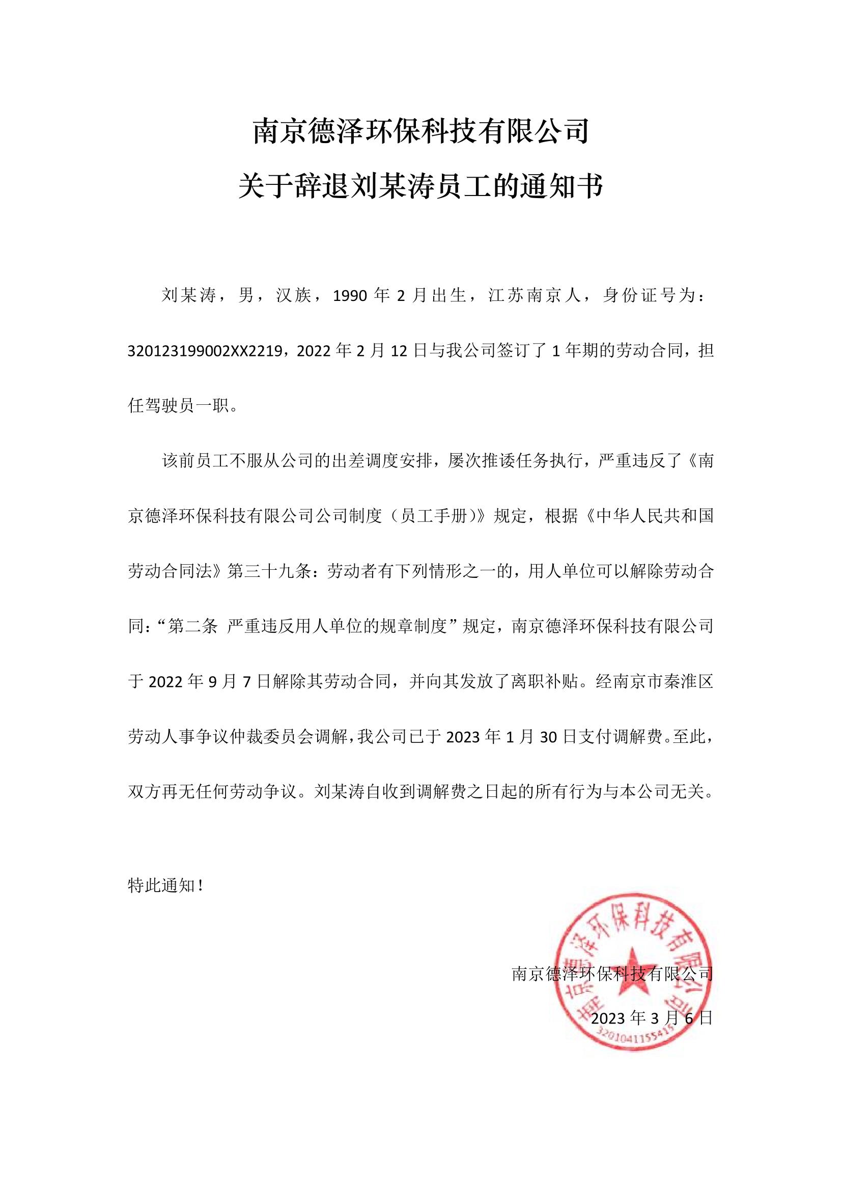 南京德澤環(huán)保科技有限公司關(guān)于辭退劉某濤員工的通知書